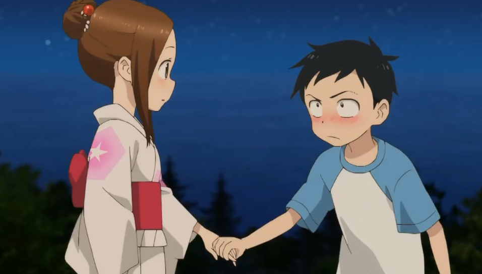 又或者在大家N刷的夏日祭上,由于拥挤的人群两人走散,后来在BGM与场景的双重渲染下(气氛组到位了),脸色通红的西片握起了辛苦找到的高木同学的手: