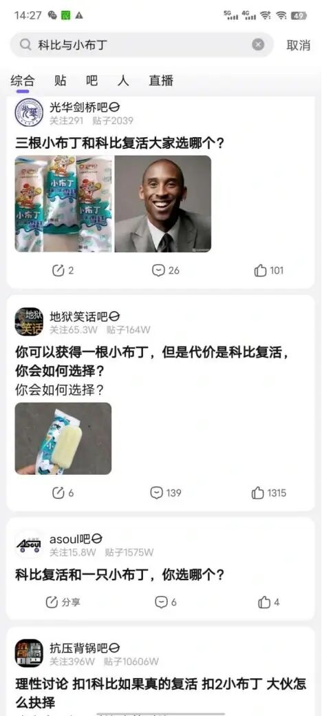 这种让人啼笑皆非的问题得到了吧友不遗余力的推广和讨论,相关帖子之多让科比直接在贴吧打起了复活赛。