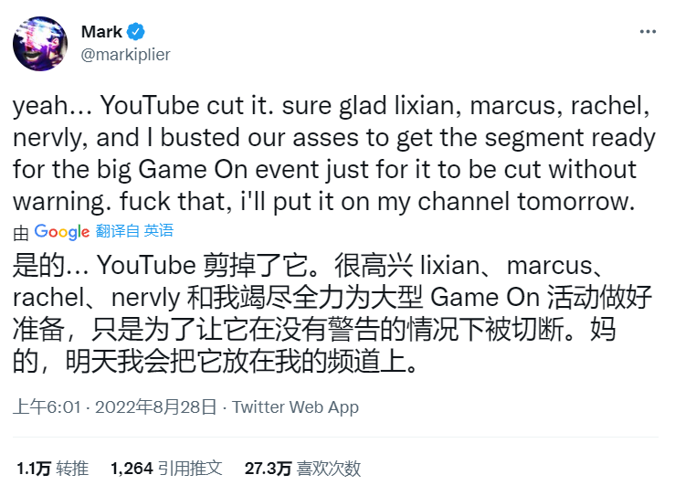 YouTube官方对此不仅没有做出回应,还试图暗戳戳的转移人们的视线,做了个激怒YouTuber们和粉丝们的举动——在最近的Youtube Game On直播中,他们切掉了Mark的大部分片段。