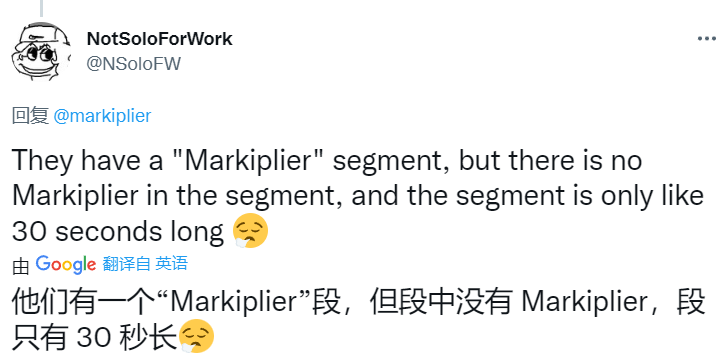 甚至 Markiplier 本人也似乎对他的片段被删减的原因感到困惑,在活动结束后不久就在Twitter发布了一则消息,表示对于YouTube的举措很迷惑——自己和他的朋友们竭尽全力制作了一段交互式视频,却在没有事先通知的情况下被删减。