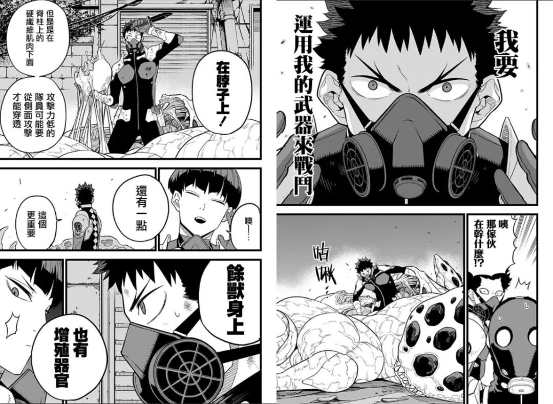 因此在《怪兽8号》中,卡夫卡的变身能力更像是一种兜底手段,在连载至今68话的几场大战中,卡夫卡对战怪兽时往往不会第一时间想到变身,而是像一个真正的成年人一样,先思考该利用丰富的怪兽知识为自己创造有利条件打败怪兽。