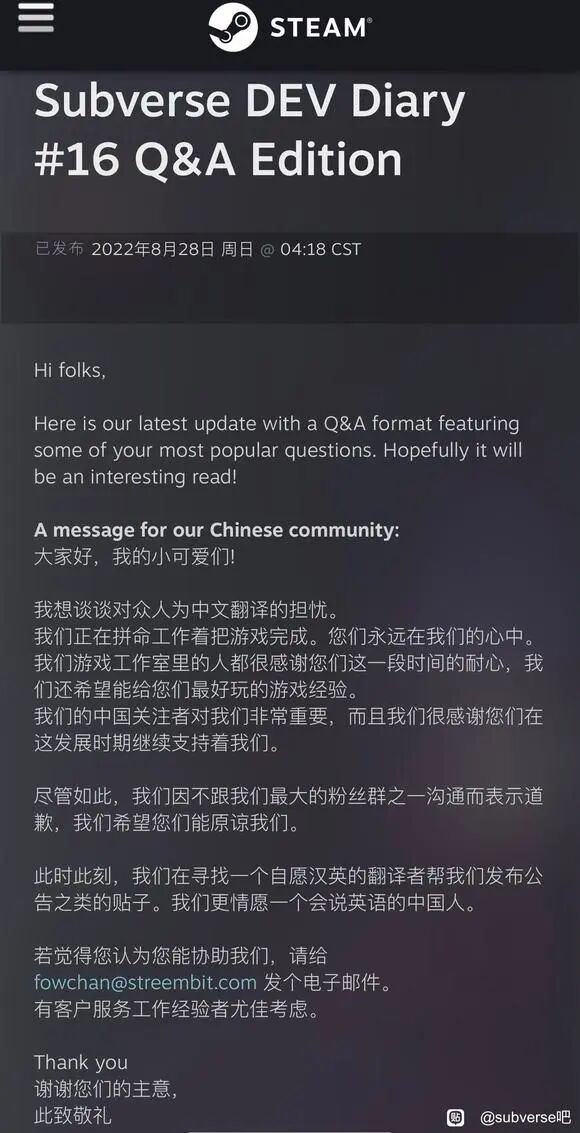 是的。你可能也听说了。曾经的3D区之光,马头社又动了。它们在steam发了个公告,宣称正在寻找一个“汉英翻译者”,帮助其完成《Subverse》相关公告的中文翻译,维持他们和中国玩家的沟通。
