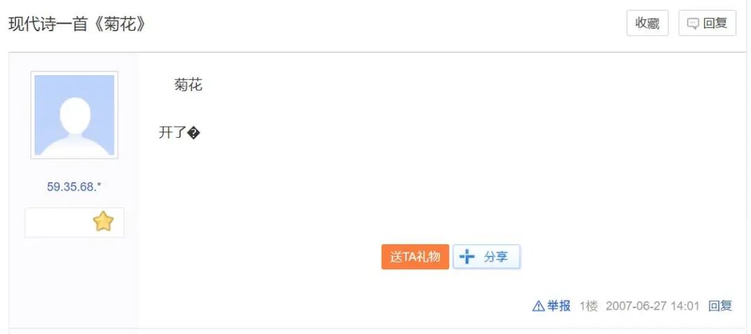 就像我小学时期所读到《繁星春水》中关于“花儿”那首诗所感受到的,现代诗歌的真正魅力,便是其自由奔放,不拘一格文字下的浓烈情感。简单的几十字,字字见血。但这种自由却不应该成为滥竽充数者用于谋求名利的肤浅形式。内容全无,空有形式,以至于用废话,乃至于屎尿屁填充,实在可笑之极。