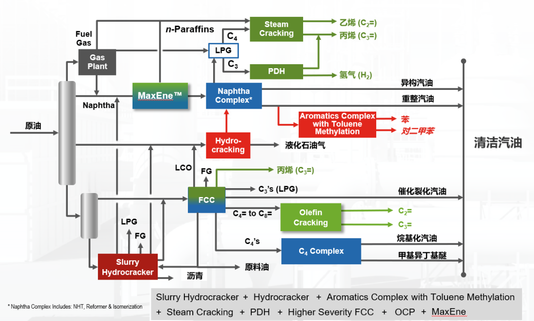 想要改头换面,炼厂需要从根本的原油转化工艺上下功夫。当然重要的前提是,要保证在更高的碳氢效率下生产产品,以避免浪费。举例来说,改造过程中,炼厂可以将炼焦流程改为浆态床加氢裂解,就可把燃料油(fuel oil)消耗掉,在此基础上,还能把以生产柴油为主的加氢裂解,改造成以生产汽油和液化石油气为主的加氢裂解,就可以把柴油利用起来;最后,如果在汽油的石脑油装置里加上芳烃装置,就能把苯和对二甲苯抽提出来,直接产出化工产品。