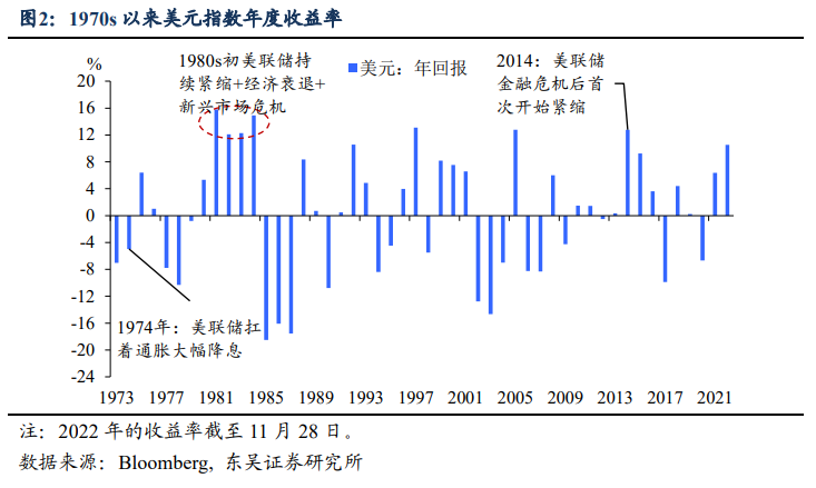 2022年,美元指数再次王者归来,2023年呢?2022年在大类资产中,除了受到严重供给冲击而大幅波动的油气外,美元指数的表现强而且稳——2022年再次成为美元大年(图1)。