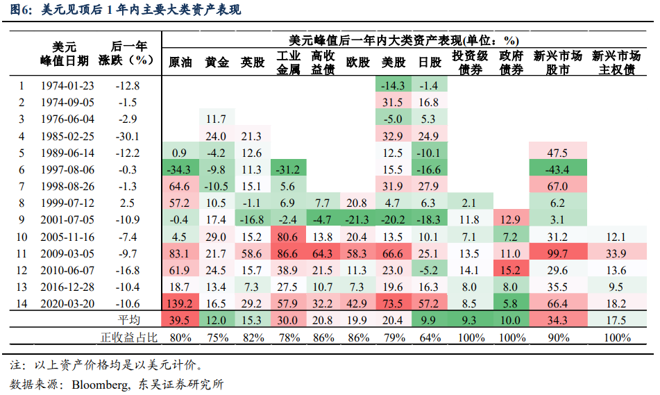 美元见顶后,哪个大类资产胜利最高、弹性最大?从历史经验看,政府债券(含新兴市场主权债)和投资级债券胜率最高,但是弹性上新兴市场股市、原油和工业金属(例如铜)更加具有吸引力。此外,黄金的空间可能比图6统计的更大,因为有经济衰退风险的加成,黄金的行情会启动得更早。