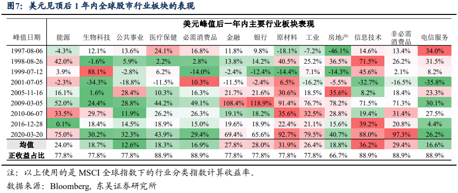 美元见顶之后,哪个板块最受益?从全球股市来看,美元见顶之后收益居前的板块是信息技术、原材料、非必选消费、银行金融和工业股。不过信息技术板块能否继续领跑存在一定的不确定性,其超额收益背后有很大一部分来自于金融危机以来货币政策在面临经济逆风时往往会快速转向宽松,这一幕可能在2023年难以出现,而其他板块在政策转向之外,还有经济边际复苏的重要逻辑。
