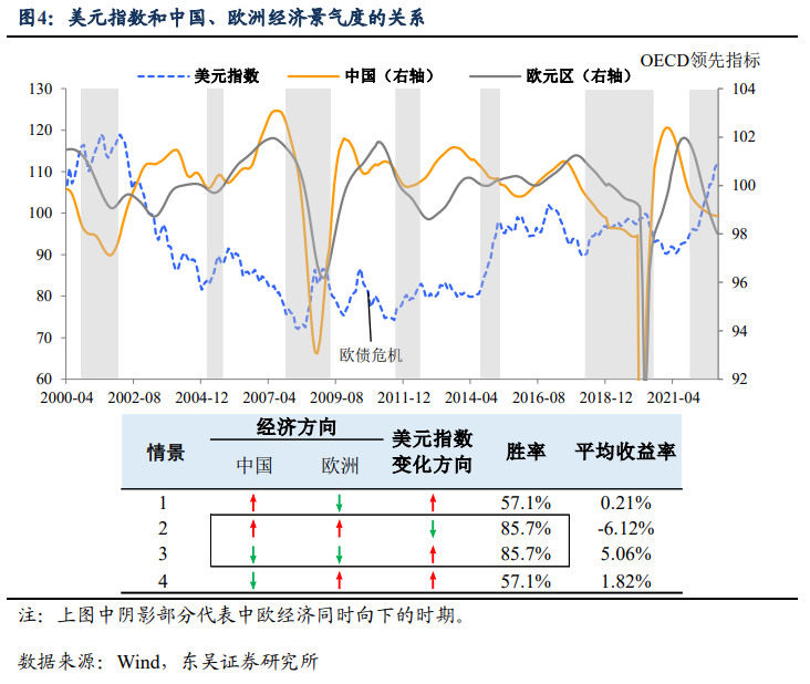 第二峰之后,如果美联储不进一步转向降息,美元是不是就没有下跌空间了?并不是,我们在之前的报告中曾经提及,美元除了要看美国自身的经济和政策外,还要注意主要非美经济体的情况,尤其是欧洲和中国——欧洲和中国经济一起边际改善将会是美元贬值的重要推手,从历史均值测算,这个贬值幅度一般能达6%。