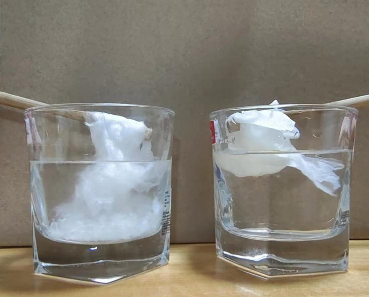 我们可以做个简单实验证实一下,如图所示,分别将一节卷纸和一张抽纸放入同样的水杯中,搅拌相同时间后,卷纸被撕裂分散开来,杯中水变得浑浊;而抽纸仍然保持完整,杯中水也比较清澈。大家如果有兴趣也可以自己试试。