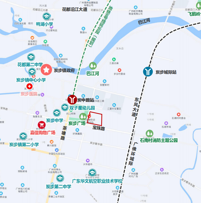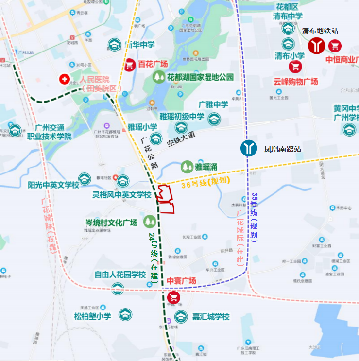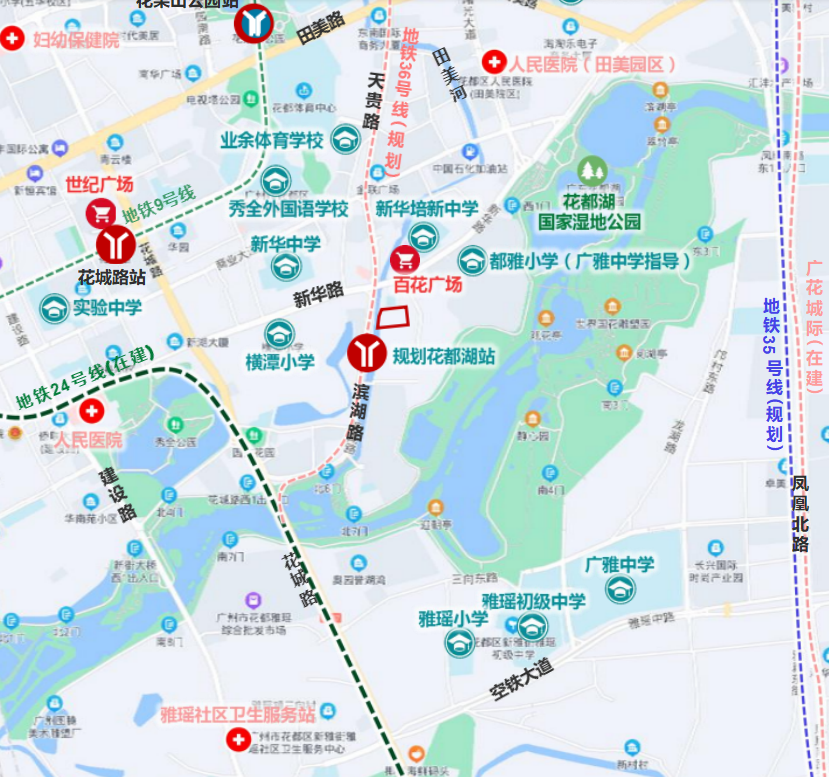 区位 :地块位于花都空铁融合示范区花都湖板块 , 紧邻花都湖国家湿地公园 ,周边环境优良 ,公共配套设施完善 ,交通便利。西临田美河和滨湖路,北近新华路。