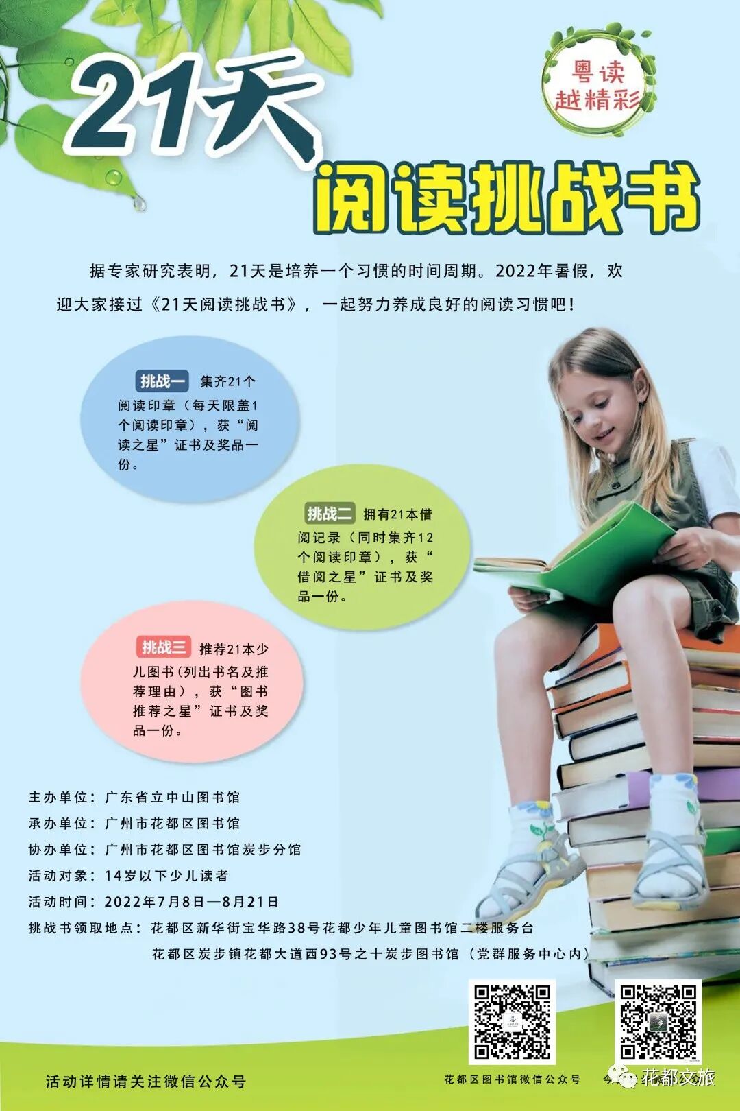 按照《省文化和旅游厅关于开展2022年“粤读越精彩”全民阅读系列活动的通知》(粤文旅公[2022]33号),21天阅读挑战书——少儿阅读习惯养成活动是今年的重要项目。花都区少年儿童图书馆将持续开展暑期阅读挑战活动,培养青少年阅读兴趣和阅读习惯。