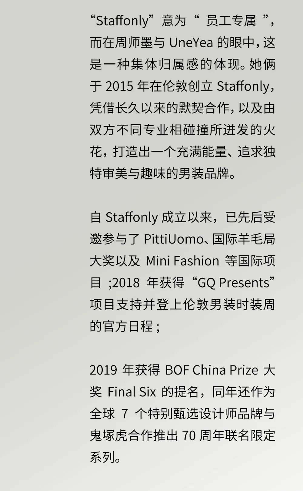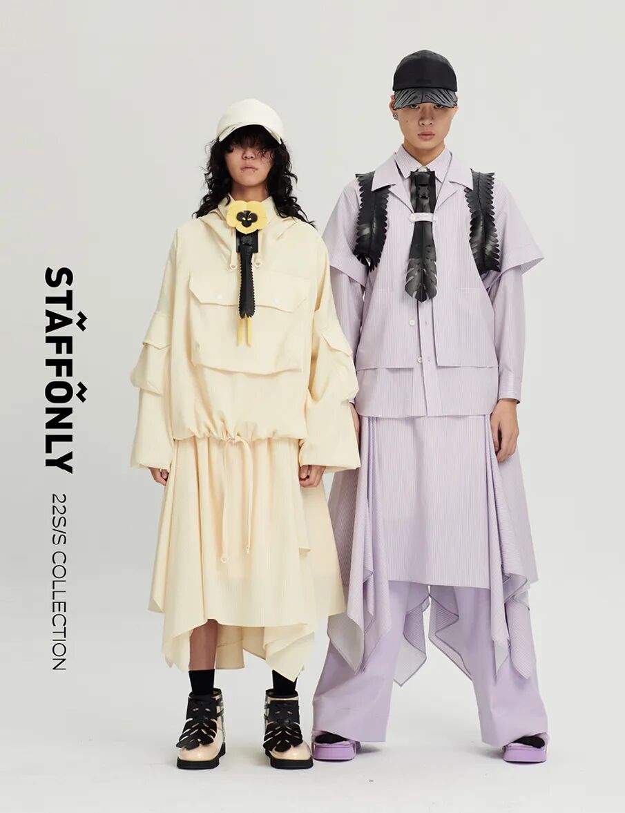 周师墨 & Une Yea:创立品牌是一个非常自发的、自然而然发生的事情,可以理解为随着本心在向前。我们是多年的同学和好友,在英国做毕业设计的过程中我们就尝试了第一次联合创作。毕业以后我们回国并定居上海,一起成立了以“Staffonly”为名的创意组织,希望借此机会能以服饰作为媒介进行创作。我们构想的Staffonly是一群人不断追逐好奇心的各种可能性,从而成为更能传递和发挥能量的集合体。