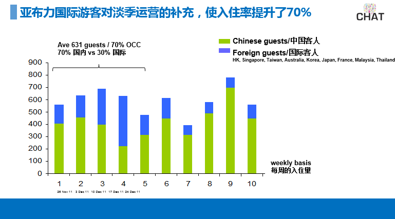 第一、我们还是非常注重去打国际市场。很多中国业主会跟我说中国市场这么大,你把中国市场做好就够。中国市场是很大,可是问题就是大家出游的时候都出游,不出游的时候都不出游,那么度假村就会有一个非常大的淡季难以弥补。亚布力的例子就很好地说明了这个问题,境外游客虽然不是很多,大概占到30%左右,但是它对淡季的弥补,对整天全年入住率的弥补非常大。因为有30%的客源使得整体入住率提到了70%,而这部分恰恰是利润的来源。