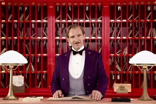 就像导演在影片最后提及的一样,古斯塔夫的形象是对旧日欧洲精神世界的美好追溯。茨威格在《昨日的世界》中深情缅怀的“文明微光”,在这个礼宾员的身上闪闪发亮。同样闪烁着的还有古斯塔夫深紫色制服上一对交叉的金钥匙襟章。他的善良和正义传递出绅士的品格,衣领上的金钥匙襟章则彰显了他引以为豪的身份。