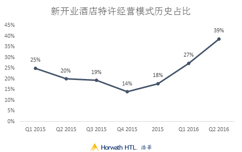 随着各大国际酒店集团逐渐放开中档及中高档品牌的特许经营权,今年上半年新开业酒店中特许经营模式的酒店占比明显上升,第二季度新开业的特许酒店占比已达到39%。国际品牌运营商与本土品牌“联姻”,如希尔顿集团与铂涛合作,万豪集团与东呈,雅高集团与华住合作,有助于特许经营模式迅速布局中端酒店市场。而在酒店业绩低迷的市场环境中,业主对于运营成本更强控制权的诉求也使得特许经营模式逐渐成为酒店业主的“新宠”。