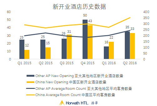 2016年上半年中国区新开业酒店53间,比去年同期增长26间。相比之下,亚太其他地区上半年新开业酒店数量与去年基本维持在同一水平线上。在客房数量方面,今年第二季度昆明花之城豪生国际大酒店(2,268间客房)的开业,将第二季度中国区平均客房数量拉升至355间。除去这家超大酒店,最近一年半中国区新开业酒店的平均客房数量维持在265至300间。相比之下,亚太其他地区酒店的平均客房规模基本稳定在200间左右。值得注意的是,受中国业主开发喜好及国际品牌在华标准的影响,中国区的平均客房数量历来高于亚太其他地区的平均水平。