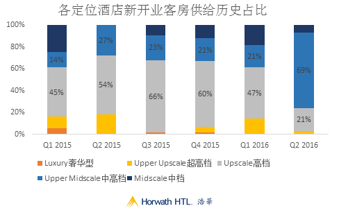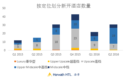2016年上半年大量中高档国际品牌酒店开业,尤其是第二季度,开业主力由高档酒店明显转向中高档酒店,中高档客房供给总量占比达到了69%的峰值。近两年,随着高端酒店开发数量趋于饱和,业主对酒店投资回报率预期越趋理性,各国际酒店集团纷纷转战中高端酒店市场,品牌投入与市场推广力度明显加强,促使了这一层级的酒店开业数量呈现明显上扬趋势。相比之下,今年上半年高档及以上酒店的新开业客房量明显降低,我们预计这一趋势将得以延续。