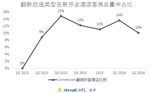 从2015年第二季度以来,每个季度约有10%到15%的新开业客房供给为翻新改造类型。经历了20年的酒店建设高峰,早期开业的酒店正经历新一轮翻新改造的高潮。借翻新改造之机会,重新定位并寻求管理模式革新,是老酒店重新焕发青春的通常之举,目的是在新增供给辈出的市场中提升酒店的竞争力。