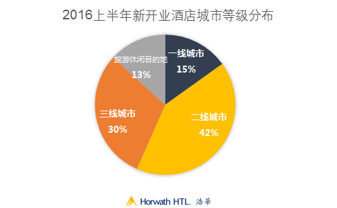 随着一线城市酒店布局的基本完成,国际酒店品牌正在积极开拓二、三线城市酒店市场。2016年上半年新开业的53间中档以上国际品牌酒店中,有22家位于二线城市,占开业总量的42%,充分表明国际酒店品牌抢占二线城市市场势头不减。此外,随着城镇化进程加快,国际品牌也加快了在三线城市的布局与扩张,今年上半年位于三线城市的新开业酒店占比已达到了30%。