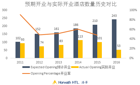 2016年预期开业酒店为243间,但截至上半年已开业酒店数量仅为53间,尽管下半年新开酒店数量将进一步增加,但我们估测总开业数量与预期开业数量仍将有明显差距。从历史数据来看,酒店预期开业时间与实际开业时间之间有明显的时间差,通常表现为延期开业。这一趋势自2012年以来表现尤为明显,延迟开业1至3年十分常见,5年以上的延期也时有发生。