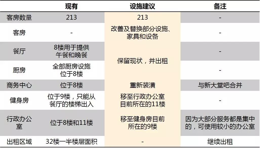 如图中报告所示,建议其保留现有客房数量,出租餐厅区域,以及保留出租区域以确保稳定租赁收入。