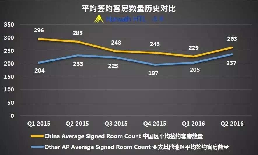 与第一季度相同的是,二季度新签约酒店仍是以中等体量(151-299)为主。由于此季度有两间超大体量酒店在云南签约,客房数分别为1,048与2,268间,使得中国区平均签约客房数量由第一季度的229间提升至263间。亚太其他地区在此季度的平均签约客房数量为237间,与第一季度的205间相比有所增加,但是与去年同期平均签约客房数233间相比则相差不大。