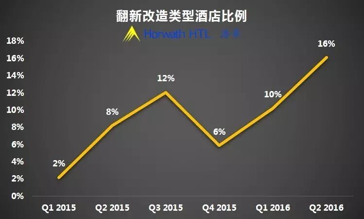 新签约酒店中翻新改造类型的酒店数量仍保持上升趋势,二季度有16%的新签约酒店是由翻新改造而来。值得一提的是,二季度翻新改造酒店全部集中在中档和中高档,且80%的酒店采用的是特许经营模式。翻新改造类型酒店增加的主要原因是市场中相当一批开业年份较长的酒店因设施老旧、功能过时而致竞争力低下。翻新改造,并以此为契机,重新考量最佳管理模式无疑是老酒店重焕青春、提升市场竞争力的变革之举。