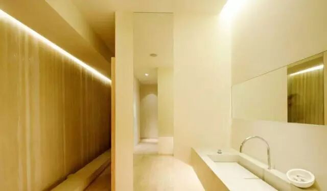 天花板的三角形管束就试图营造出这种空间的深邃与连续,让人忘记自己身在何处。放松与私密被放在了首位。此外,大堂和走廊的墙面都涂有 DM 漆,每隔一段就有一道灯光,更加强了走在时光隧道中的感觉。