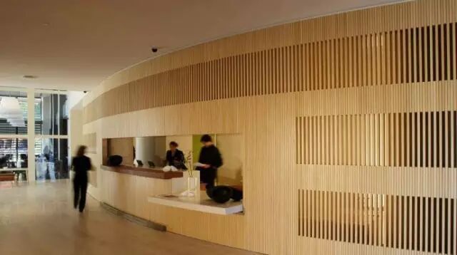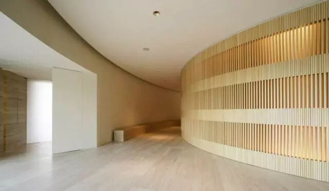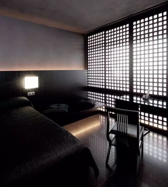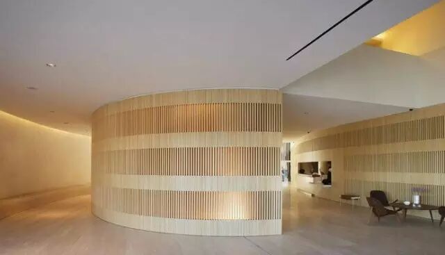 英国设计师约翰·帕逊(John Pawson)一贯主张竭尽所能的去除所有装饰,只以空间、光线和材质作出空间变化。在他负责设计的酒店大厅与会客室中,大面积的运用原木,以类似日本传统千条格子形成流动半穿透的空间,塑造出享受平静与安宁的空间。