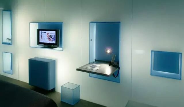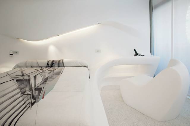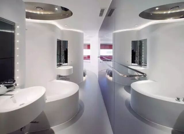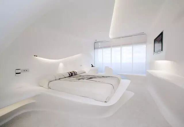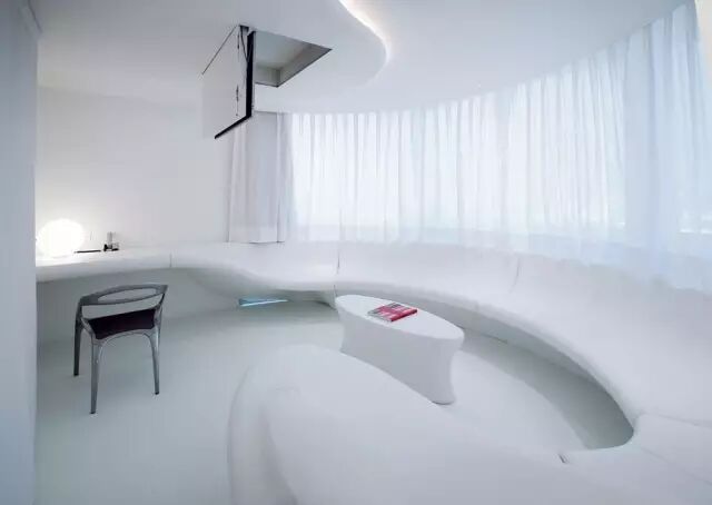 扎哈为酒店设计的这个客房让客人感觉走进了一部科幻小说,矛盾的是,这超越现实的情景又是真实的,触手可及。扎哈·哈迪德借助数字化设计创造了一种语言,让人们敢于幻想不一样的世界。诸如德国魏尔阿姆赖因的维特拉消防站和德国莱比锡为宝马设计的建筑作品都让她成功跻身行业顶尖之列。