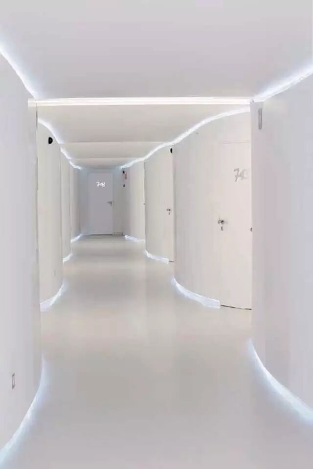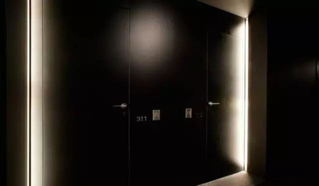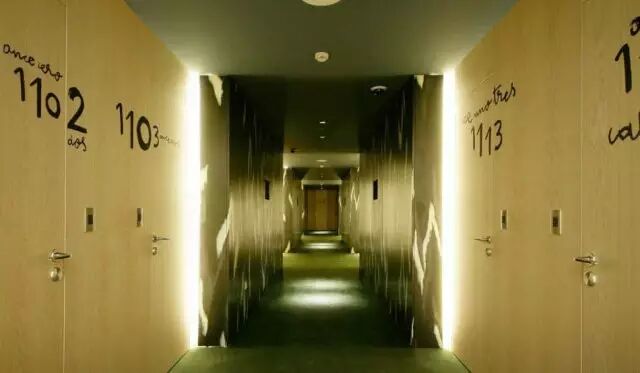 9 层有着工业色彩的外观。走廊看起来像一座工厂内部的走道,或是刚刚装配完毕的办公空间,天花板、大堂墙面和走廊的纤维水泥进一步强化了这一印象,而地面铺着的又是羊毛地毯。门顶、房间和房间号都由地面的LED 照明,构成了走廊里仅有的光源。