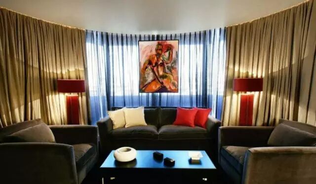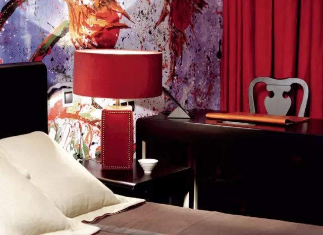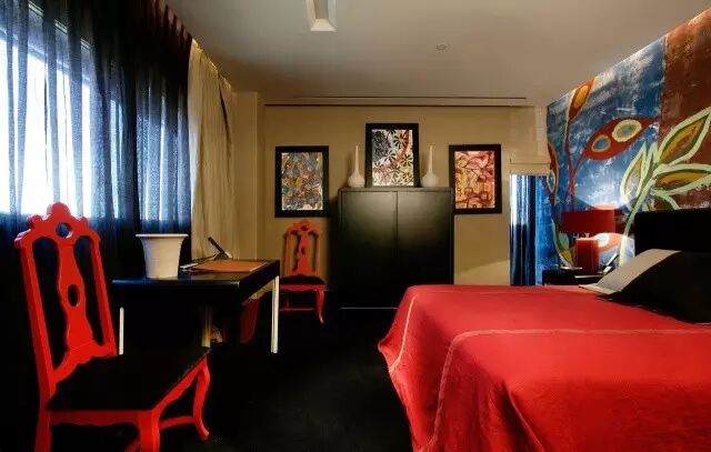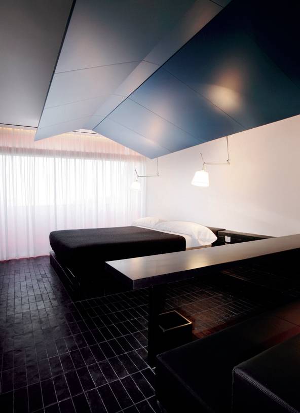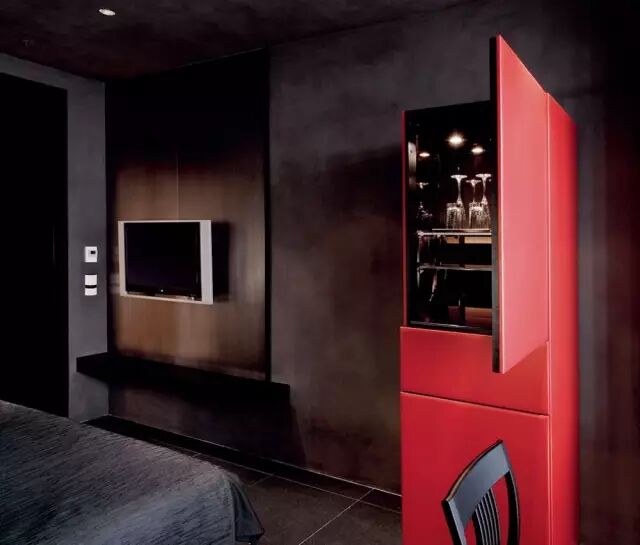 采用了圆角的黑色家具也是著名设计师定制。然而维多利奥和卢基诺二人的作品中最独特的地方还是选用的织物——用于编织精美的双色床罩、窗帘和靠垫的亚麻、天鹅绒和棉布;用金属扣件固定的红色天鹅绒底座;内部为黄金的红色天鹅绒屏风;参考了中式家具风格的红黑两色扶手椅。客房采用了传统的布局,床边有一张桌子。
