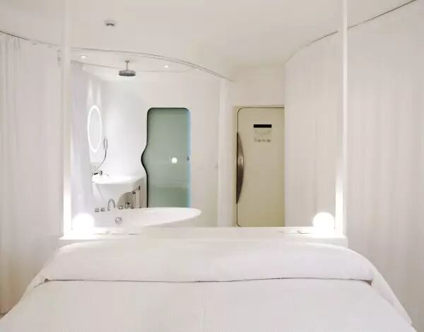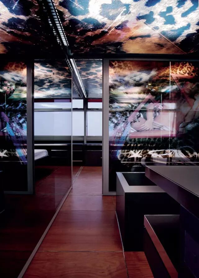 苏格兰建筑师凯瑟琳·梵德雷作品的创新之处在于打造了一个交互的空间。她对融合技术与建筑的兴趣也体现在与交互设计师杰森 • 布鲁杰斯的合作上。最终二人成就的室内空间足以刺激感官,创造惊喜,客人除了被牢牢吸引住以外根本别无他想。此外,客房内部全部以布帘区隔,就连壁橱也没有装门。总体来看,设计散发着浓浓的女性色彩,令人浮想联翩。