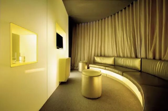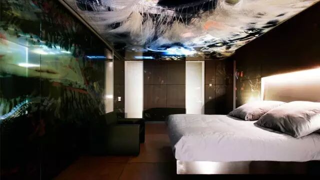 它是对空间的互动性构思,互动性这是两位设计师进行设计的根本性前提。他们为大堂专门打造的纤维光学面板被布鲁杰斯称作“记忆之墙”,会将客人的动作捕捉下来,之后再在彩色点构成的面板上放映出一个扭曲的版本。大堂的天花板是一面外翻的拉伸帆布,仍像一块球茎。
