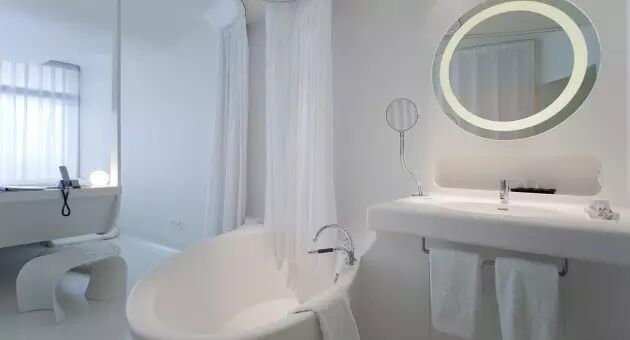 除此以外,浴室天花板是一块背光的拉伸帆布,让客人仿佛置身一座人工日光浴场。福斯特标志性的高技理念在此项设计中再次得到了体现。人们在浴室会觉得自己成了一部科幻小说的角色,而不是入住马德里市中心酒店的游客。总之,这是一个柔韧、动感和技术性的空间。