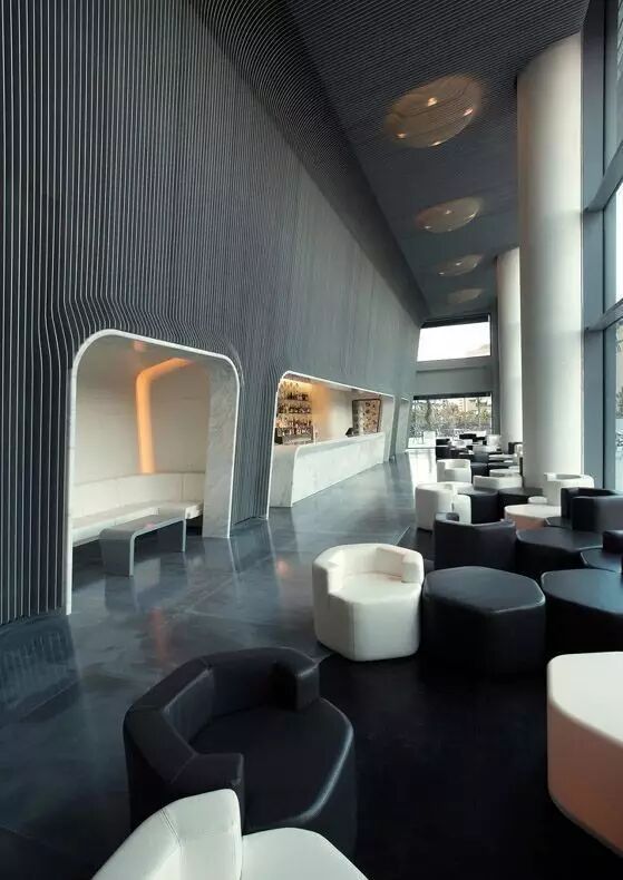 当客人走出电梯,来到大堂,就会看到一个充满动感与变化曲线的空间。客人首先会注意到一个造型弯曲修长的灯(或许因为形似飓风,名叫Vortexx,取意于“Vortex”,漩涡)主导了整个空间。灯是由哈迪德和帕特里克·舒马赫共同为品牌Sawaya&Moroni 而设计的,非常引人注目。它被置于与视线平齐的高度,目的是让客人可以细细欣赏每一处的曲折变化。