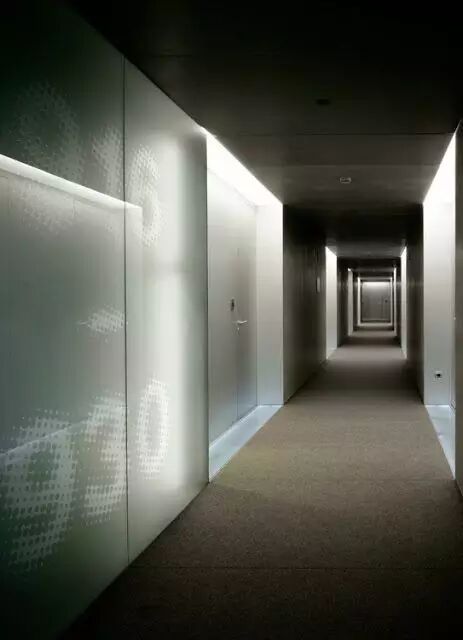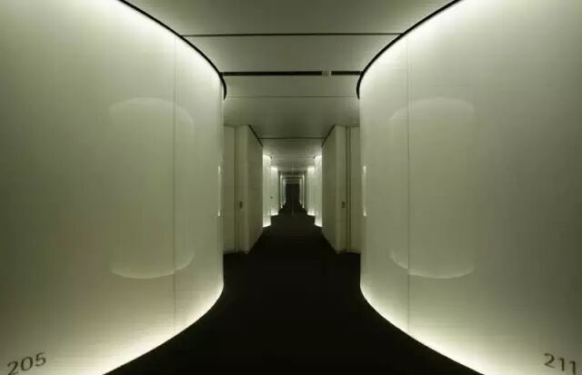 接着往下走,走廊两边的墙面就像一个个巨型背光式半透明玻璃灯笼,让空间显得更加动感,同时这也构成了将走廊与客房室内连接起来的核心要素,—客房淋浴间墙面同样采用了这一设计。