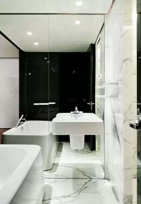 这两块地方的核心概念是对比。大堂是一个十角形,涂以特殊的白色刮漆并铺设了大理石砖,与走廊粗砺的深灰色漆以及黑色的羊毛地毯形成了鲜明对比。