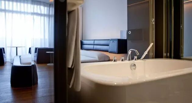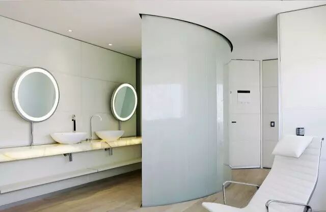 建筑师为这座酒店专门设计了一个极其宽大却又看起来轻盈的座椅。床则由位于床头板下方的卤素灯照明,方便客人在躺下放松时还能进行阅读。卫生间从地板到天花板通体颜色与客房颜色保持一致。浴缸和洗手池完全连为一体,马桶是斯蒂凡诺·乔凡诺尼为意大利家用品设计品牌艾烈希设计的,与哈迪德建筑标志性的圆润未来主义线条配合得恰到好处。废纸桶也是专为酒店而创作,非常考验客人的想象力,因为你很难找到它。