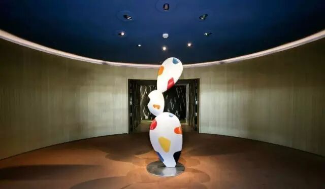 一个是巴斯克雕塑家,一个是英国建筑师,两个极具创造力的艺术大师共同塑造了这个设计—它混合了玻璃等高技材料和毛毯皮革的温暖质感,既刺激人们的情绪,又微妙得难以言喻。走入二层的大堂,最先迎接客人的是中国艺术家展望的雕塑。四周墙面包裹了米白色皮革,为客人营造出一种私密感。