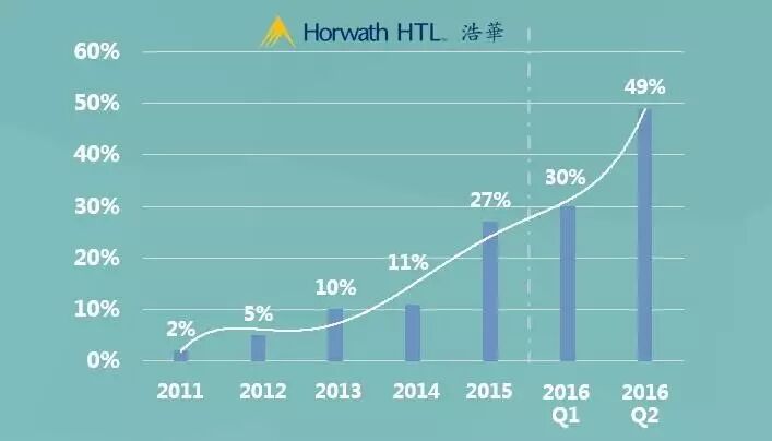 着眼全球,特许经营都是一种主要的管理模式,近五年中国特许运营模式下的酒店项目明显增多。从上图可见,特许经营在华签约数量在2011及2012年略微增长,从2013年起有了明显提升。此后的2015年经历了较大幅度的增长,达到27%,且增长趋势仍在延续。2016年第一季度,特许经营模式占签约酒店总数的30%;第二季度,近一半酒店选择了特许经营的管理模式。