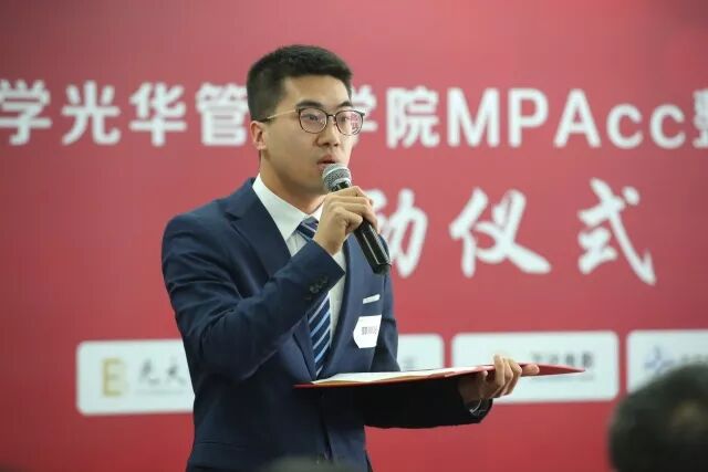 郭照阳同学作为2017级MPAcc学生代表发言,他表示整合实践项目搭建了一个联通学生和企业的桥梁,一方面使得同学们可以基于自身知识体系,在实际演练中提高综合能力,另一方面,大家也希望可以充分利用所学在一定程度帮助企业解决实际问题。不同于书本中的原理公式,商业实践更为错综复杂。因此本次整合实践项目对于工作实习经验相对有限的大家而言是一个挑战,更是一个机遇。他代表每一位同学郑重承诺,一定会以饱满的热情投入到整合实践项目中去。