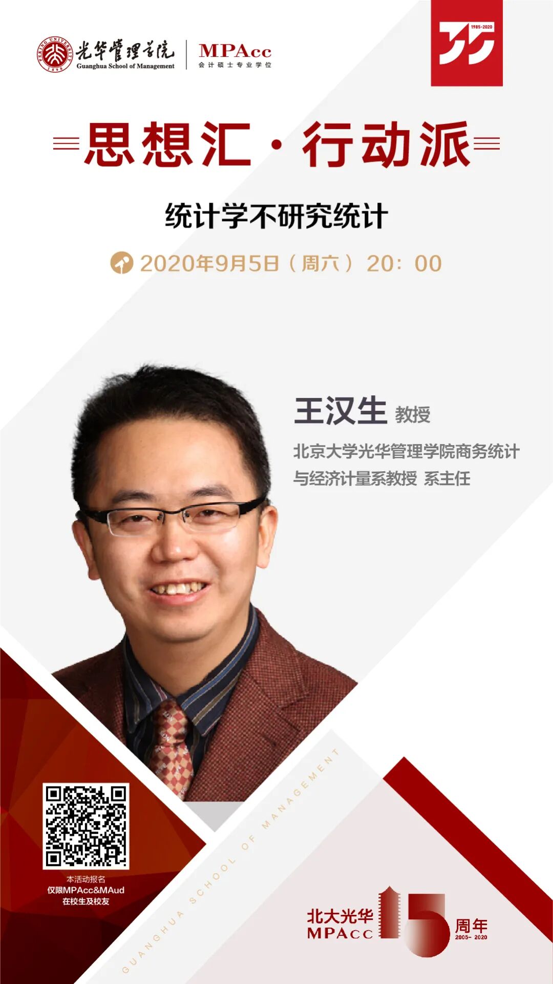 2020年9月5日晚,北大光华MPAcc【思想汇·行动派】系列分享会第九期在线上顺利举办。本次分享会邀请到了北京大学光华管理学院商务统计与经济计量系系主任王汉生教授,为大家分享题为《统计学不研究统计》的讲座。