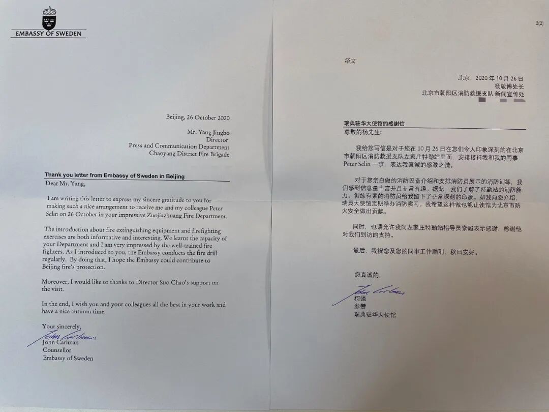 在走进大使馆开展培训前,瑞典王国驻华大使馆安全参赞卡尔曼一行前往朝阳区消防救援支队左家庄特勤站开展交流调研,并对全体指战员精湛的业务技能和配备精良的车辆装备给予高度评价。