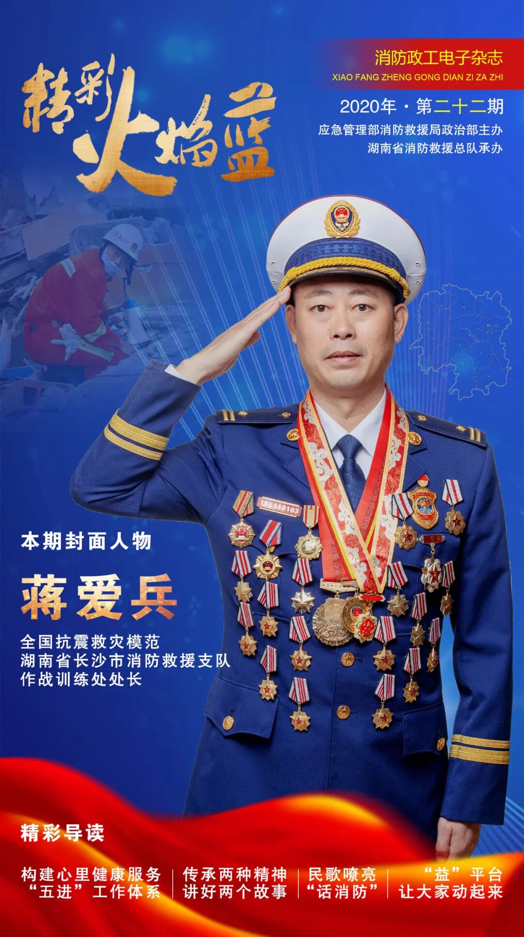 封面人物:为您介绍“全国抗震救灾模范”、长沙支队作战训练处处长蒋爱兵。他24年扎根基层、冲锋一线,先后荣立个人一等功4次,二等功6次,用赫赫战功将忠诚的旗帜高高擎起,演绎着消防人对党绝对忠诚的精彩传奇。![]()
