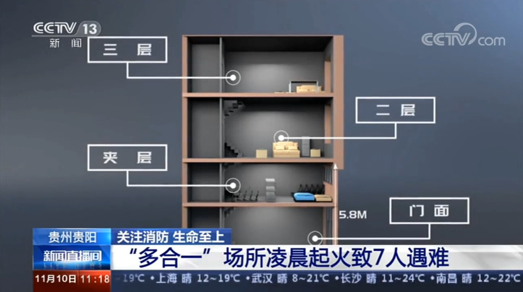 事故发生后,火灾原因调查员对现场进行勘察发现,起火楼房共三层,其中一层为生产经营门面,高5.8m,搭建夹层用于存货和住人,二层供人员住宿并设有厨房做饭,三层用于人员住宿,是典型的“多合一”场所。