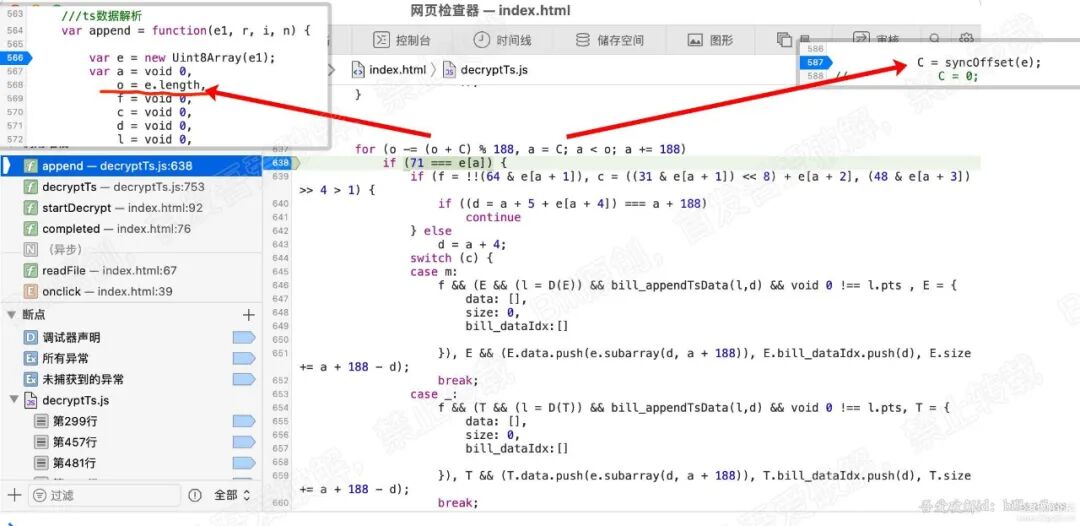 运行demo, 输入key,导入ts。提前在append函数首行打上断点。点击开始解密。会进入我们的断点。