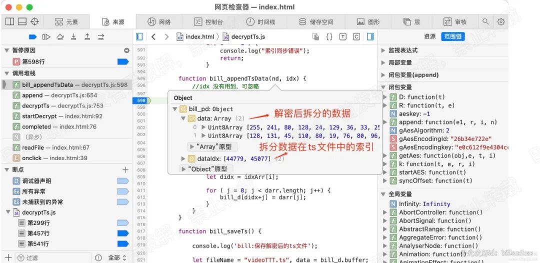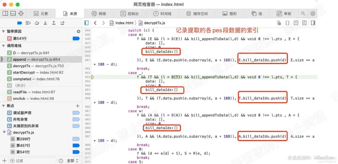 接下来进入循环开始解析ts数据了。注意代码中 bill开头的函数与变量,是用来解密的。暂时忽略。