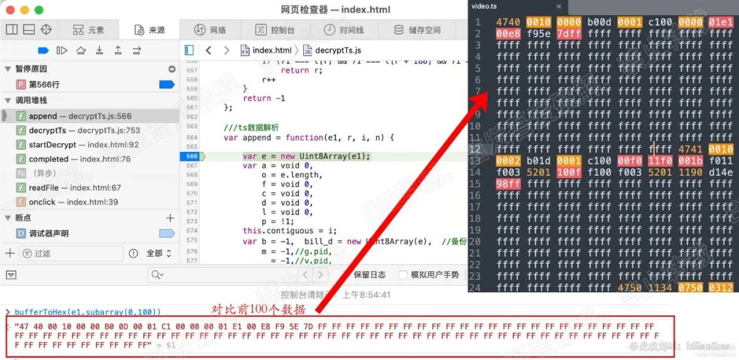 为了便于调试,这里我用未解密的video.ts文件作为样例,以及自己写的解密demo,来分析。