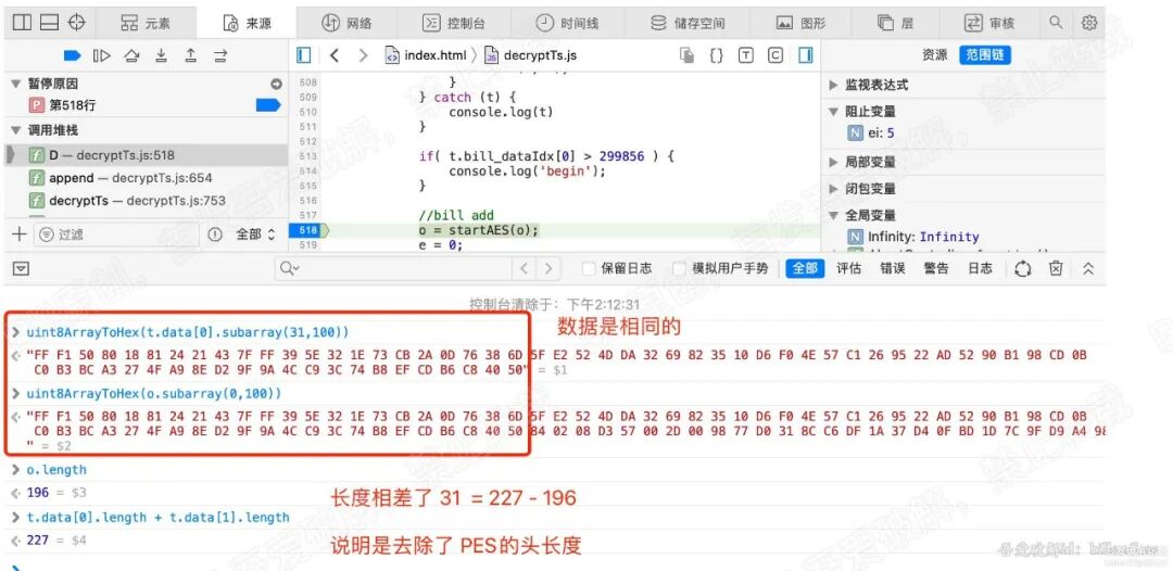 因为此时记录的索引是包含PES的头的长度。实际的解密数据是不包含PES头的。